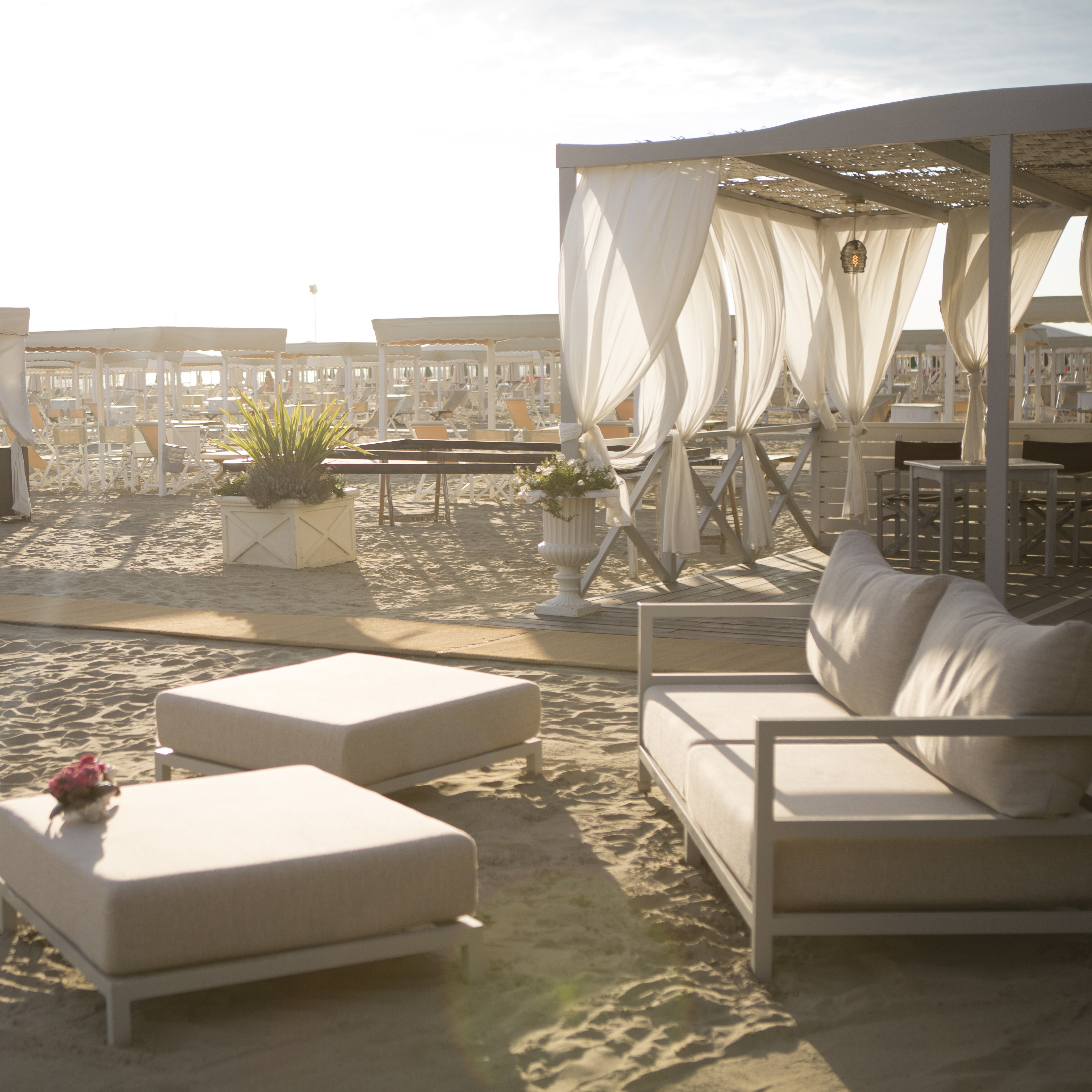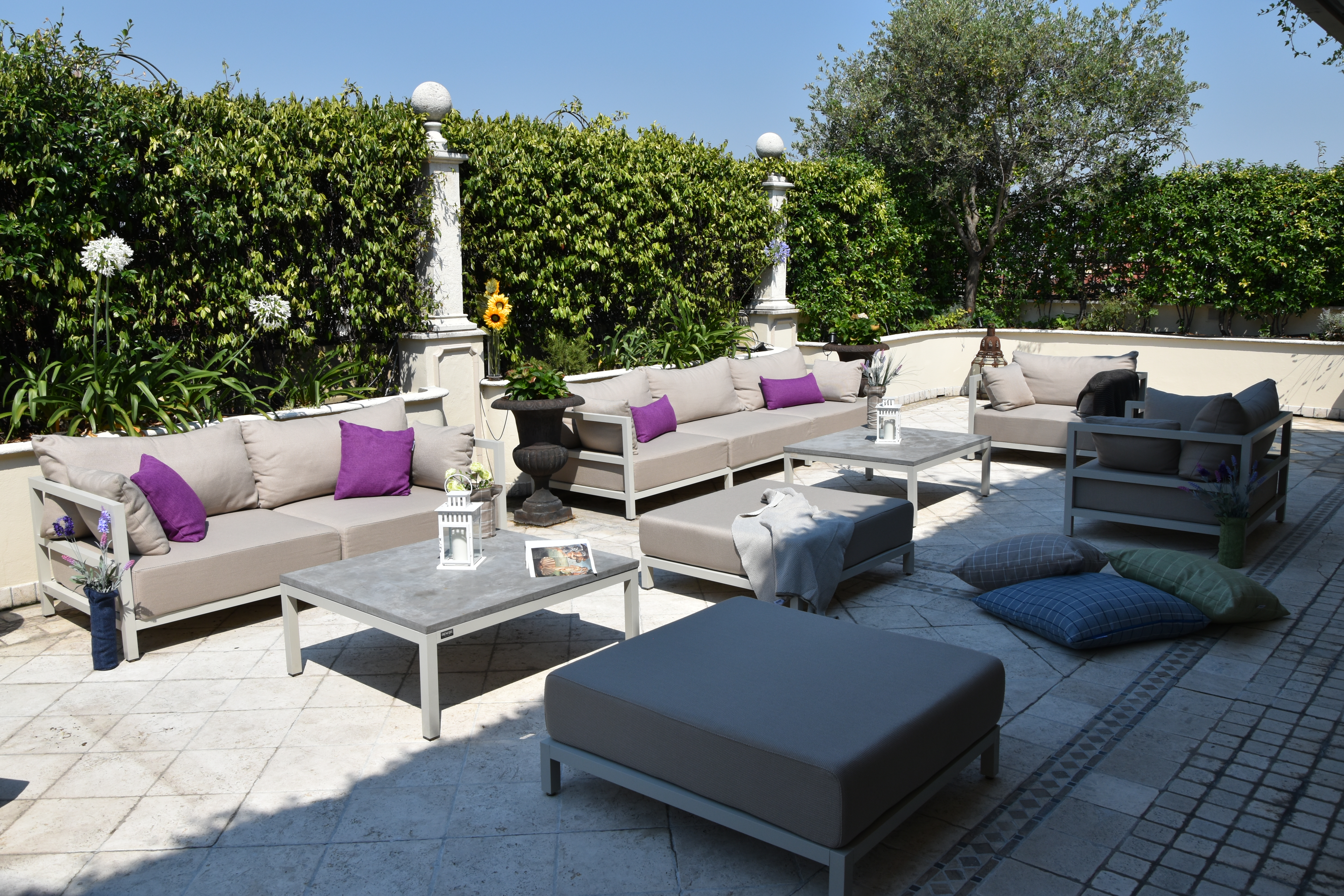 Struttura in alluminio verniciato dalle morbide forme raffinate e delicate e rifinito coi migliori materiali e tessuti.