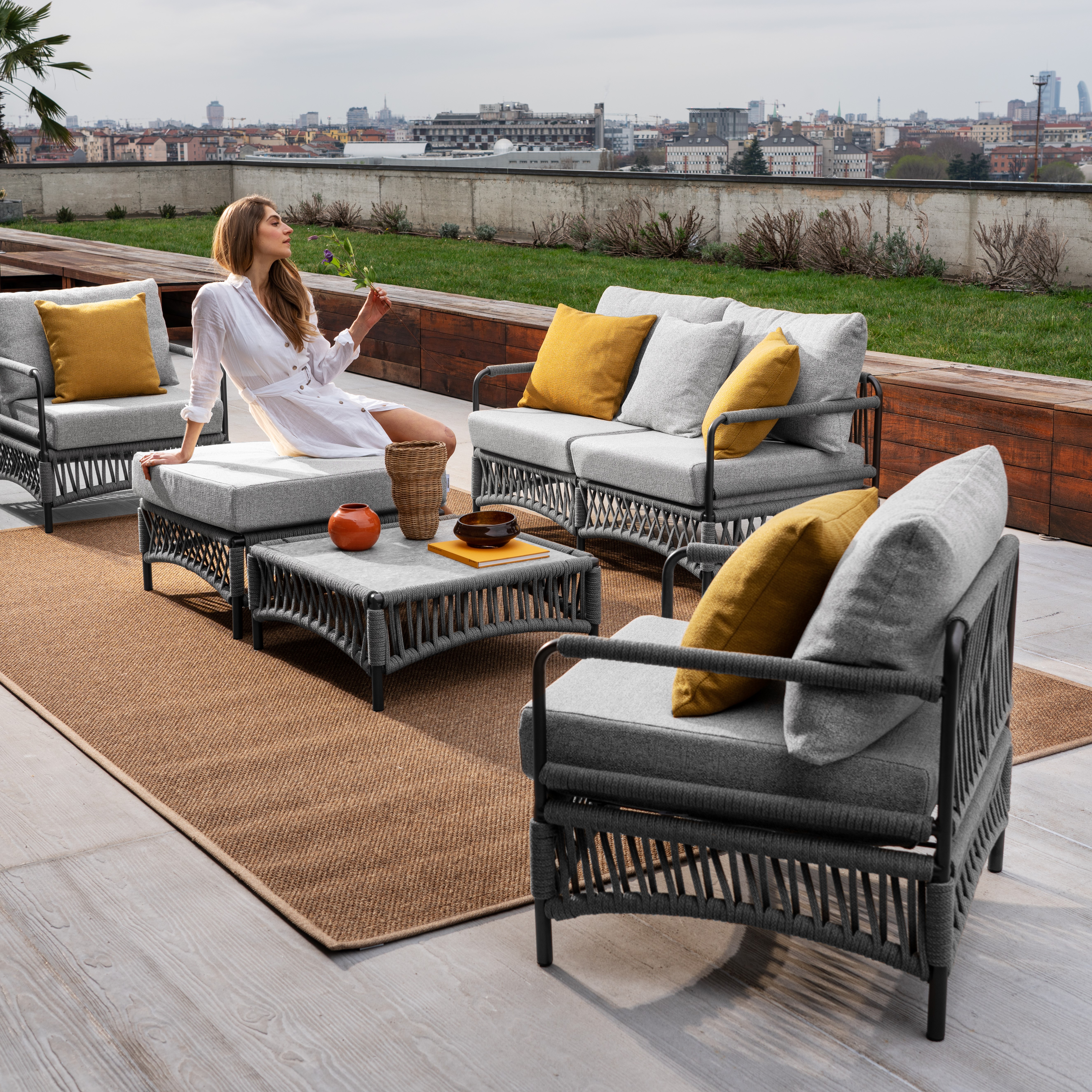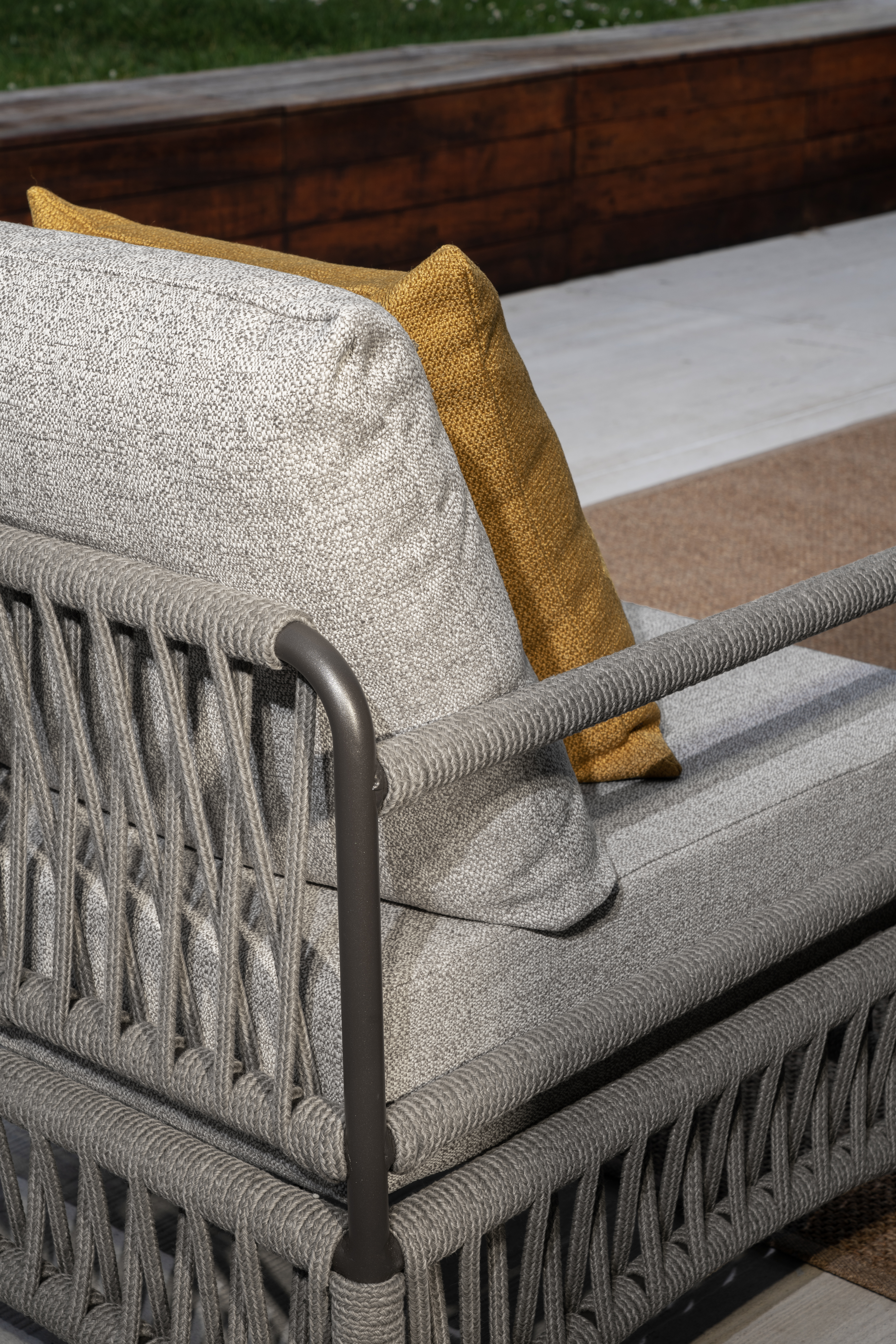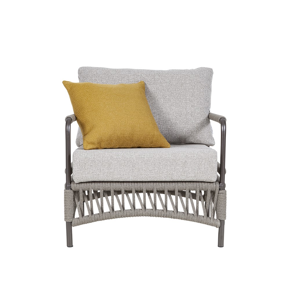 Le avvolgenti e morbide poltrone della Collezione Cannes si rivelano un intenso e accogliente abbraccio di relax outdoor. Gli intrecci di corda emozionanti che addolciscono la fredda struttura metallica percorrono lievemente i braccioli e tutta la parte sottostante la seduta imbottita.
