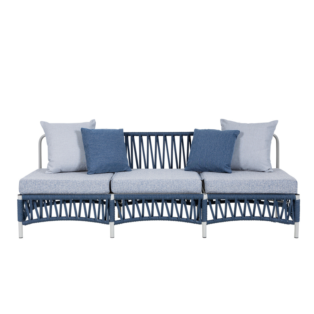 Il lettino della Collezione Cannes ha una struttura metallica nella parte sottostante ricoperta da particolari intrecci di corda che, scorrendo dall’alto verso il basso e viceversa, ne percorrono tutto il perimetro. Si compone di tre cuscinature e nella parte anteriore un particolare sistema permette di avere uno schienale reclinabile all’occorrenza. È un ulteriore elemento versatile della collezione: con l’aggiunta successiva di uno schienale laterale si trasforma in un sofà tre posti privo di braccioli alle estremità. Il Cannes lettino è perfetto per riposare, leggere, o stendersi al sole.