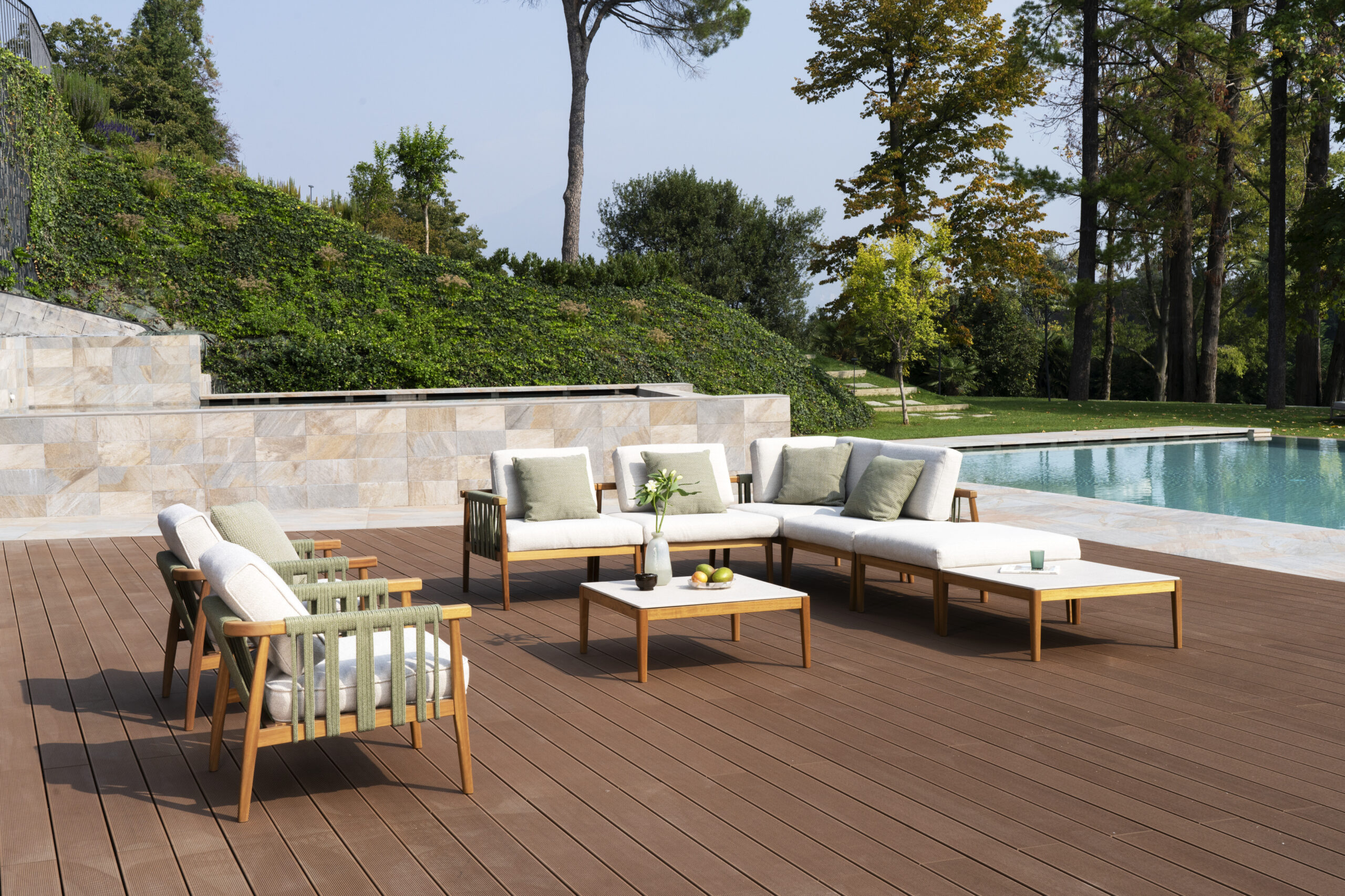Il Divano Pantelleria si compone di due o tre sedute: semplici ed eleganti imbottiture, trame, forme e corde intrecciate raccordano i braccioli e lo schienale. Il legno Iroko dalle linee eleganti descrive sedute accoglienti per un perfetto angolo di relax e convivialità all’aria aperta.