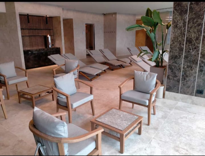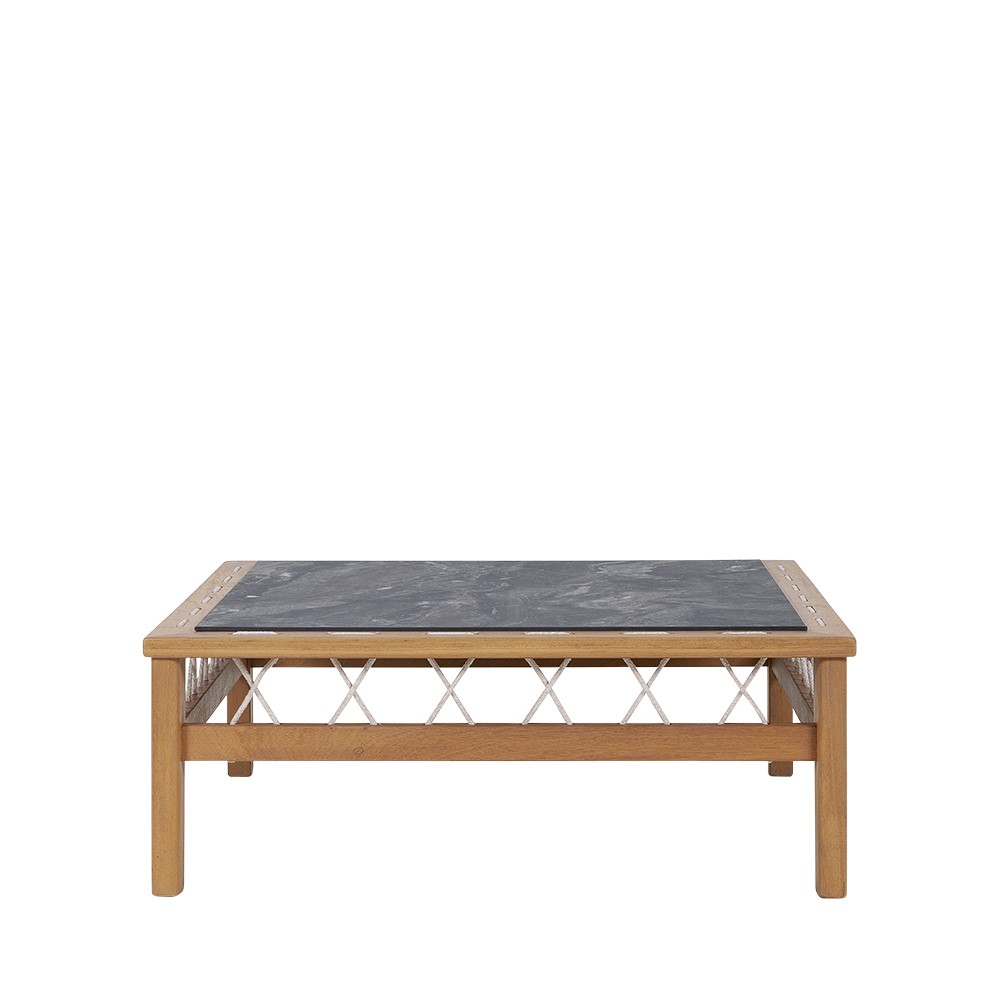 La versatilità della Collezione Zenit è emblematica. Nel suo tavolino la struttura perimetrale in legno Iroko si arricchisce di un top in laminato.