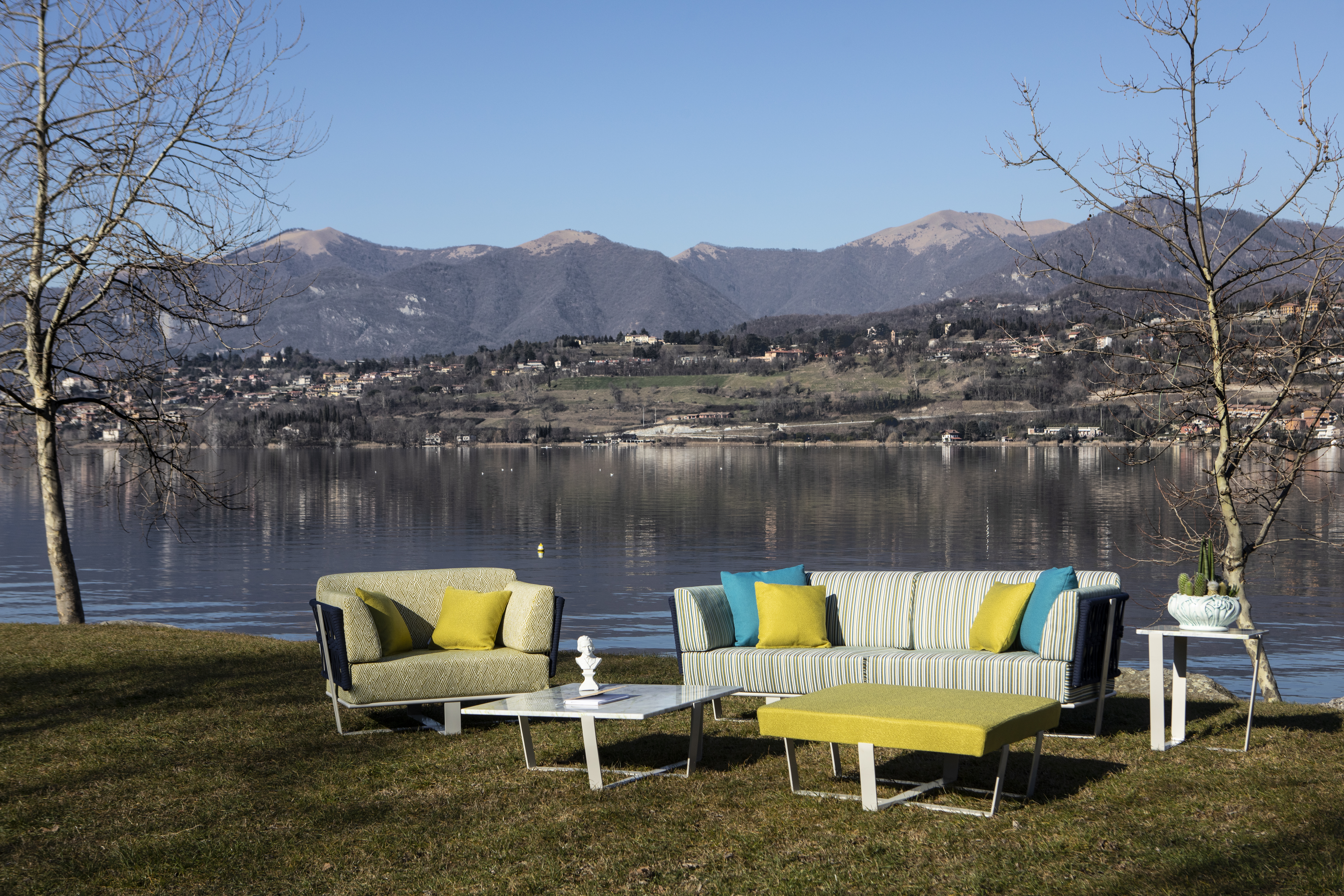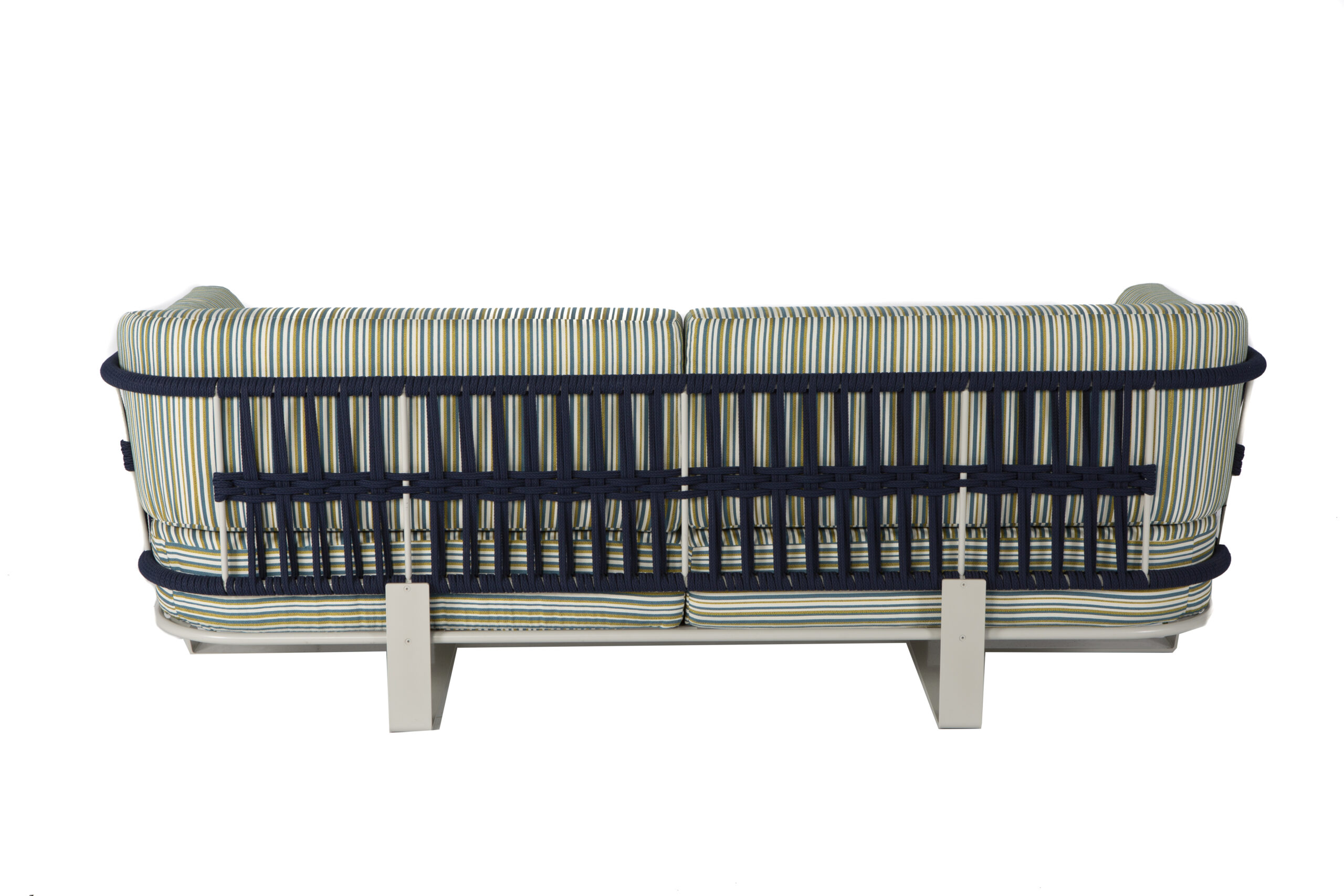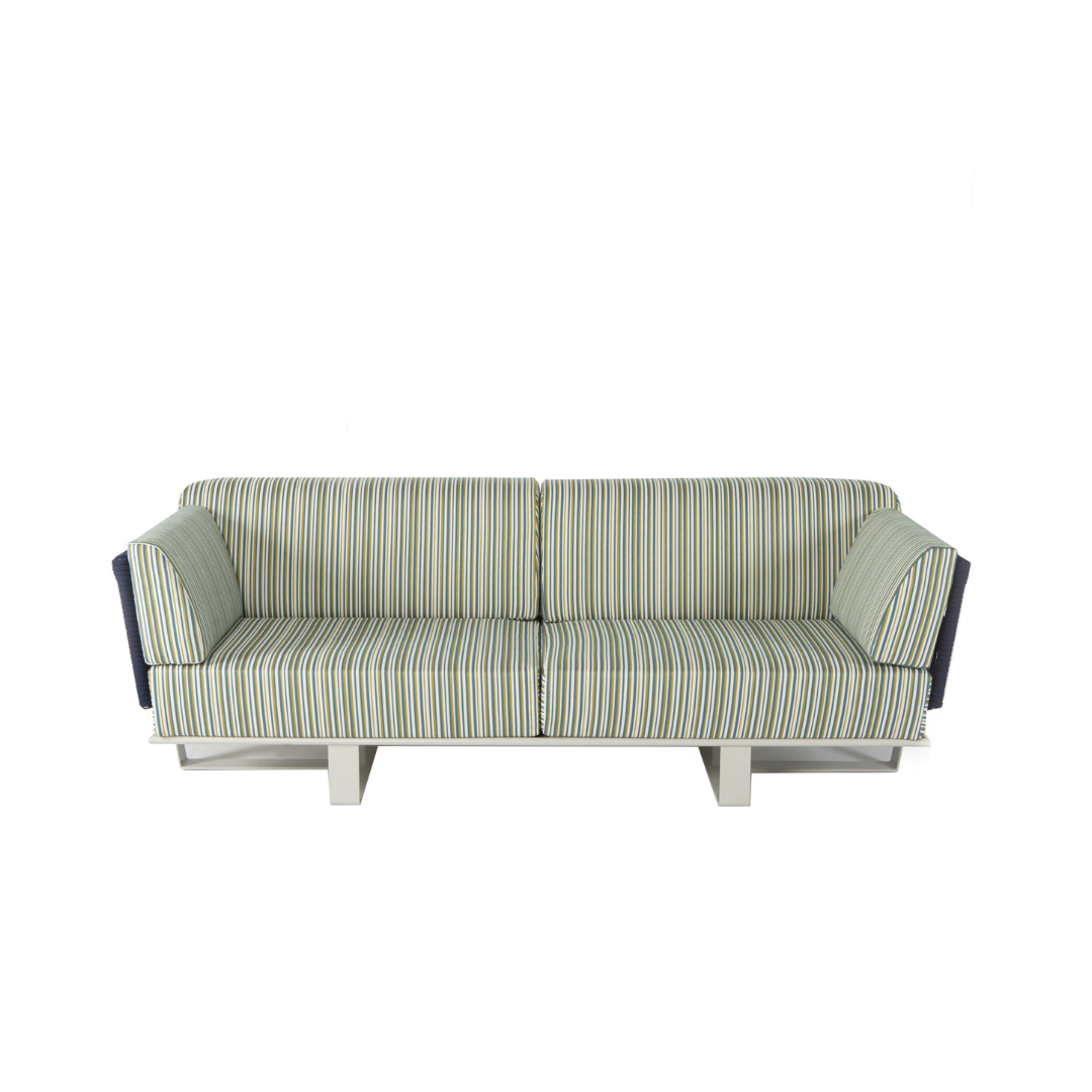 Il Divano Viareggio con la sua omonima Poltrona, ricordano i colori frizzanti delle spiagge toscane. Forme semplici ma funzionali, caratterizzate dacromatismi energici.Gli intrecci di corde che ricordano le cime nautiche dei grandi yacht, elemento principale e linea guida di tutta la collezione, fanno da sostegno alle ampie cuscinature, il tutto sorretto da gambe in metallo verniciato.